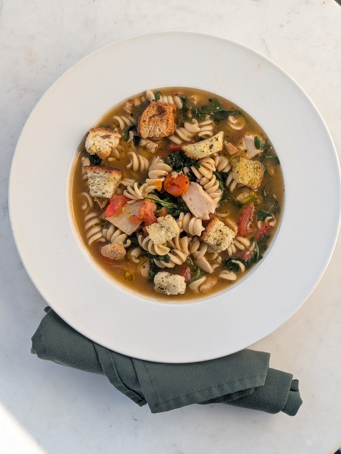 5. Ladle soup into bowls, top with croutons and garnish with freshly grated Parmesan cheese, cracked black pepper, and a drizzle of olive oil.